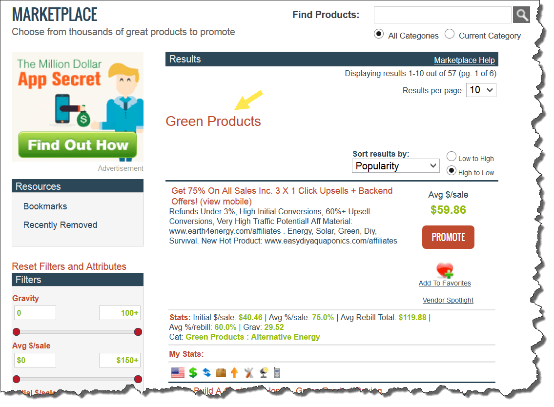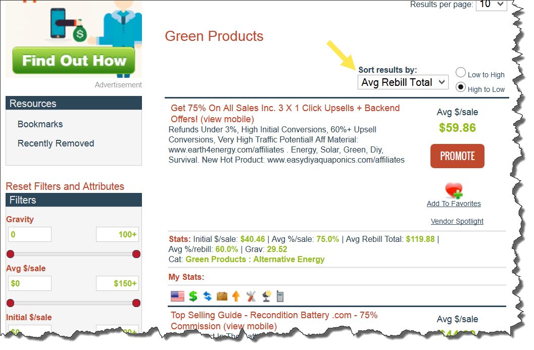 To find the recurring income products, change the Sort button from Popularity to Avg Rebill Total: