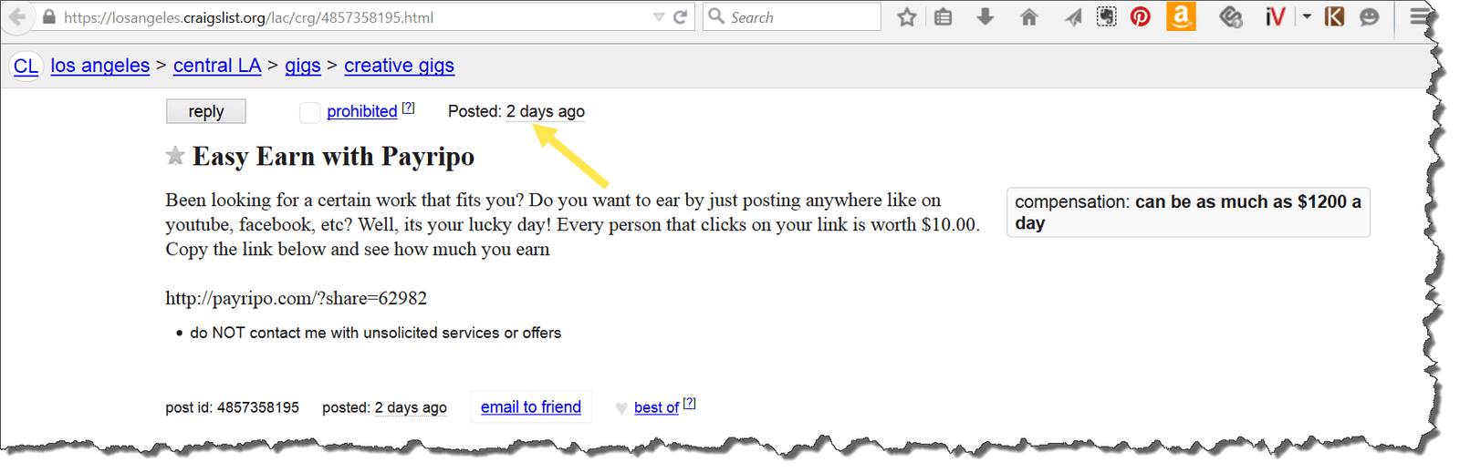 This is from two days ago. You'll find a whole bunch of these ads plastered all over Craigslist, YouTube, and a whole host of other websites as well.
